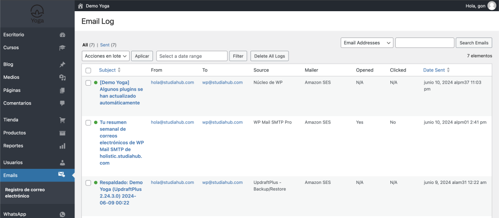 En esta nueva pantalla podremos ver todos los emails que envío la plataforma.