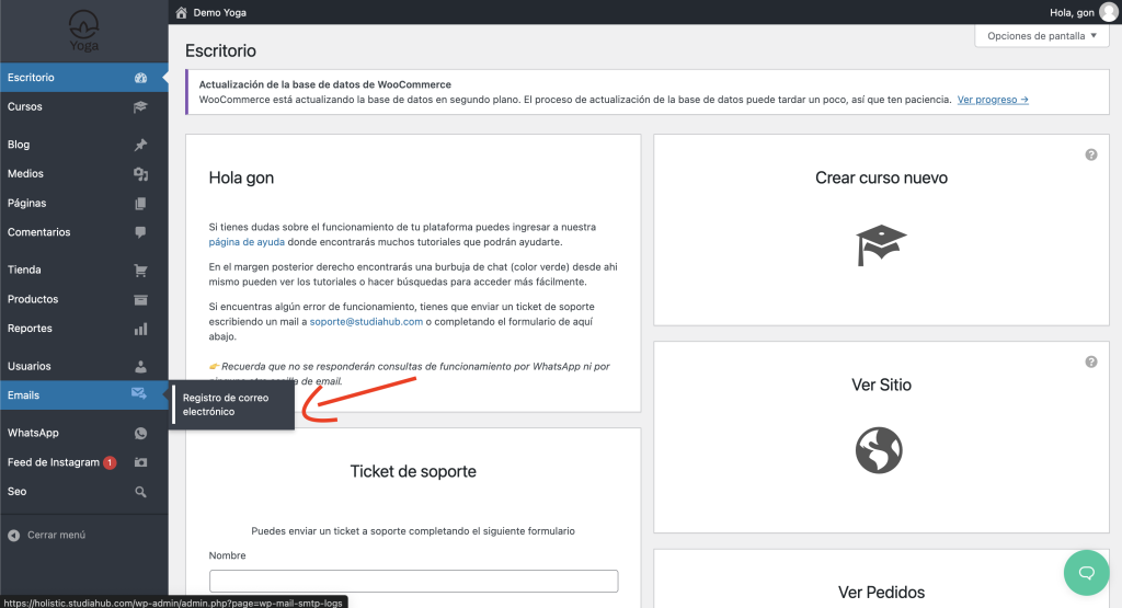 Ingresamos en “Registro de correo electrónico” dentro de la opción Emails del panel administrador.