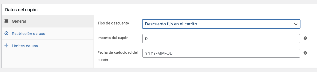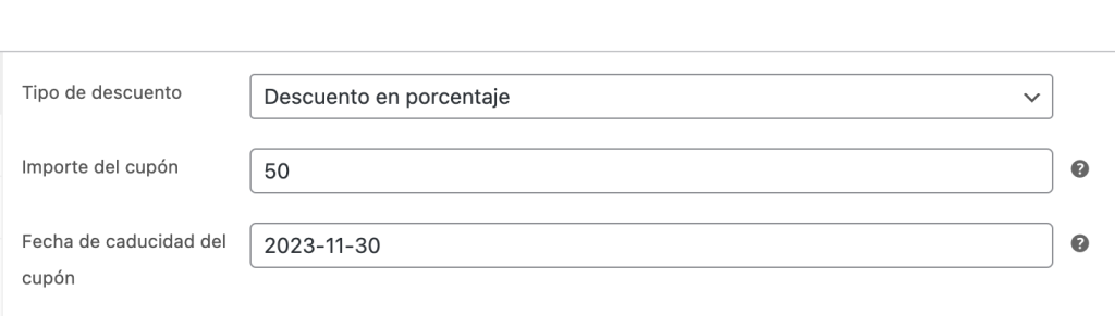 Si queremos que el cupón sea del 50% off ponemos únicamente 50.