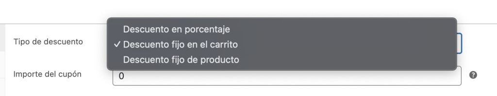 Descuento en porcentaje: Si quieres hacer un descuento en porcentaje (por ejemplo 50% OFF). Descuento fijo en el carrito: Si quieres hacer un descuento de monto fijo (por ejemplo 20usd).