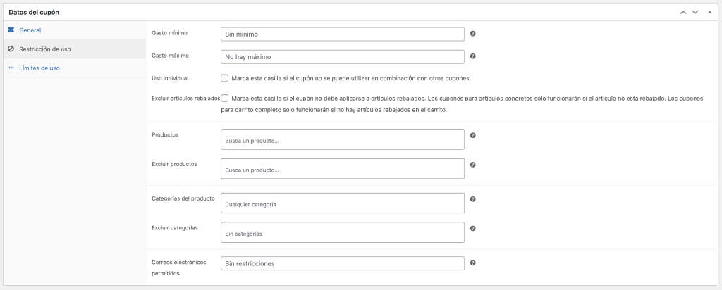 Gasto mínimo: Puedes configurar que el cupón funcione solo si el carrito supera un monto mínimo. Gasto máximo: Puedes configurar que el cupón funcione solo si el carrito no supera un monto máximo. Uso individual: Si activas la opción, el cupón no es combinable con otros cupones. Excluir artículos rebajados: Si activas la opción, el cupón no es válido para cursos que ya tengan una promoción aplicada. Productos: Puedes elegir el producto que desees, de esa forma el cupón solo funcionará con ese producto. Excluir productos: Puedes elegir el producto que desees, de esa forma el cupón funcionará para todos los productos menos para el seleccionado. Categorías: Puedes elegir la categoría que desees, de esa forma el cupón solo funcionará con esa categoría. Excluir categorías: Puedes elegir la categoría que desees, de esa forma el cupón funcionará para todas las categorías menos para la seleccionada. Correos electrónicos permitidos: Puedes configurar que el cupón funcione solo con el mail de algún usuario (por ejemplo [email protected]).
