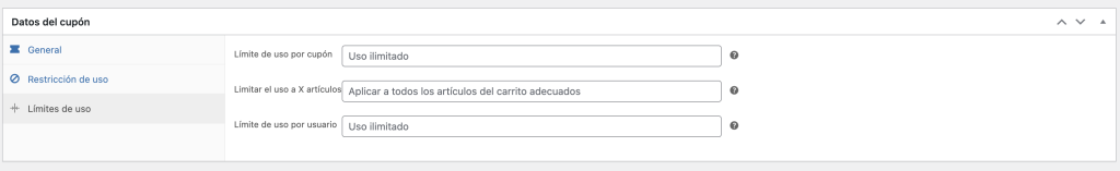 Limite de uso por cupón: Si no ingresas nada, el cupón es ilimitado. Pero puedes poner 2 por ejemplo, de esa forma el cupón funcionará 2 veces. Limitar el uso a X artículos: Si no ingresas nada, no habrá limite de artículos para que aplique el cupón. Es decir, si alguien agrega 10 cursos al carrito, el cupón aplicará sobre los 10. Limite de uso por usuario: Si no ingresas nada, no habrá limite de uso por usuario. Pero puedes poner que ese cupón sea utilizado solo una vez por usuario.