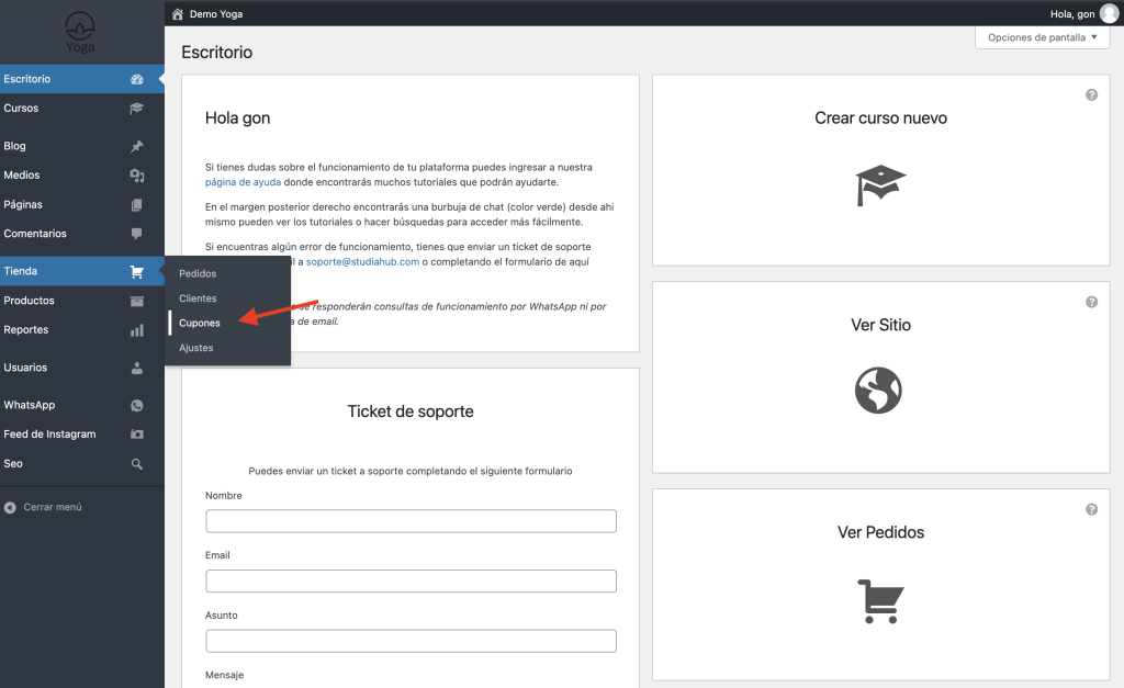 En el menú lateral de tu panel administrador, tienes que ingresar en “Tienda” – “Cupones”.