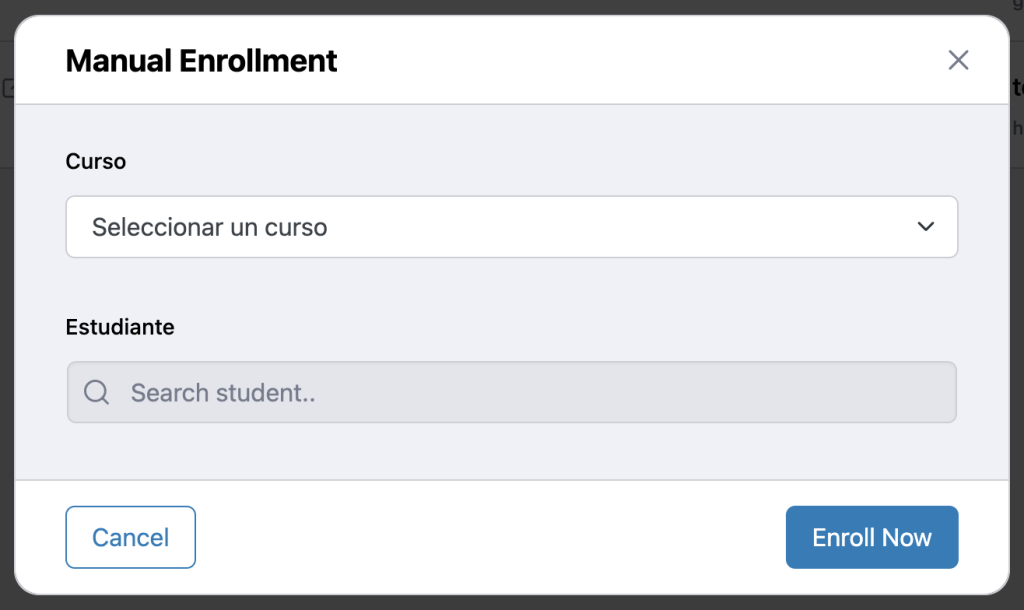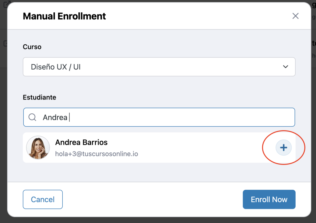 Primero elige el curso y luego en “Estudiante” podrás buscar al usuario indicado, seleccionalo haciendo click en el ícono “+”.