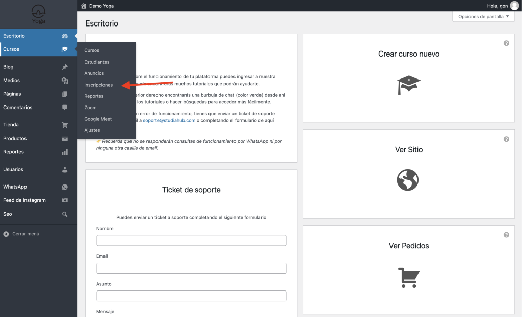 Luego, deberás dirigirte a “Cursos” y ahí elegir la opción “Inscripciones“.