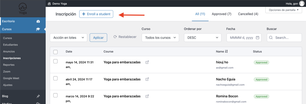 En la nueva pantalla, verás un botón que dice “+ Enroll a student”, tienes que hacer click ahi.